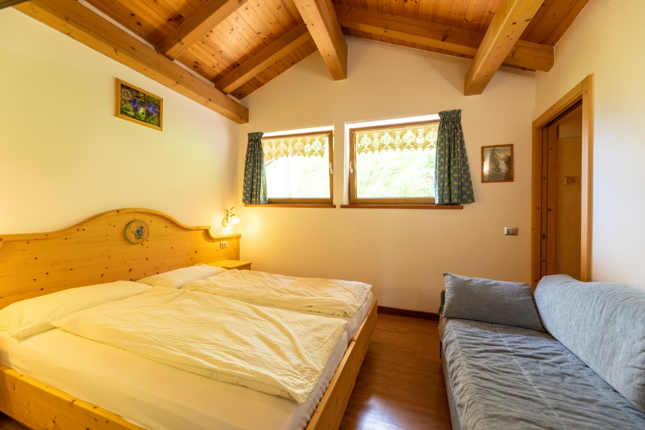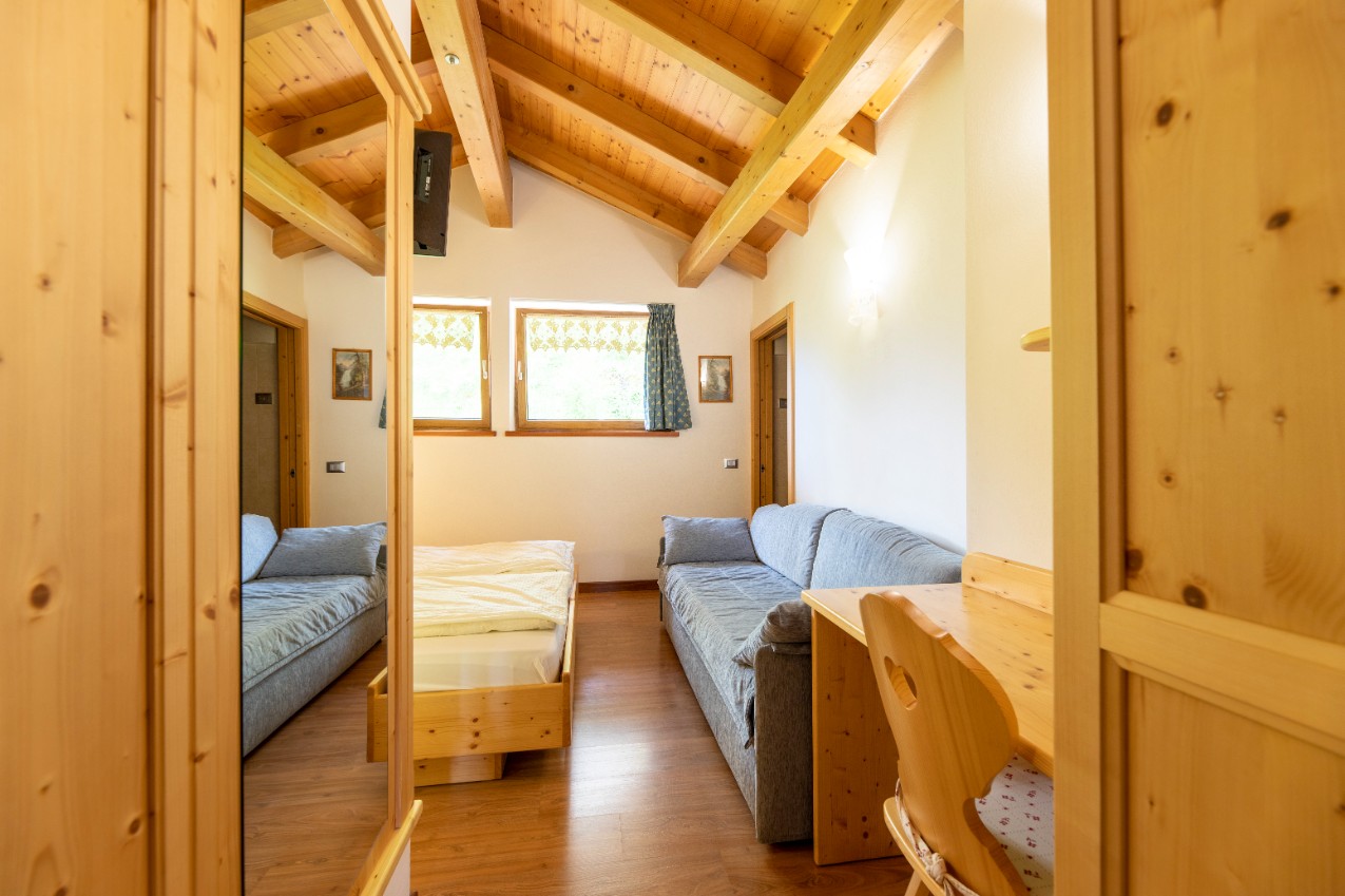Questa stanza è un invito a immergersi nell'atmosfera calorosa della tradizione alpina, con arredi che combinano funzionalità e charme.